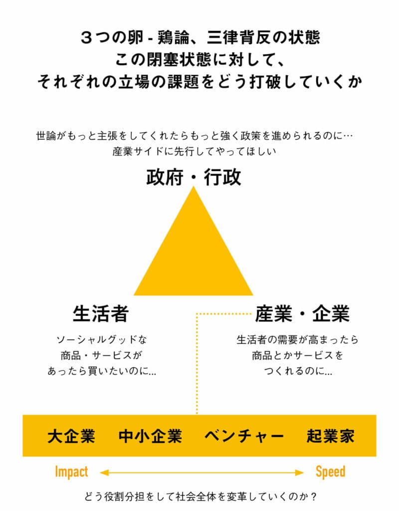 2016年以降、僕も政府、企業、生活者の方々のお話にいろいろと悩んだりしましたが、それぞれが口を揃えて言っていたのは「ほかの2つの環境がもっと進んでくれたら、自分たちももっと進めることができるのに!」という「三律背反」 & 「卵-鶏論」 & 「他力本願」みたいな話。