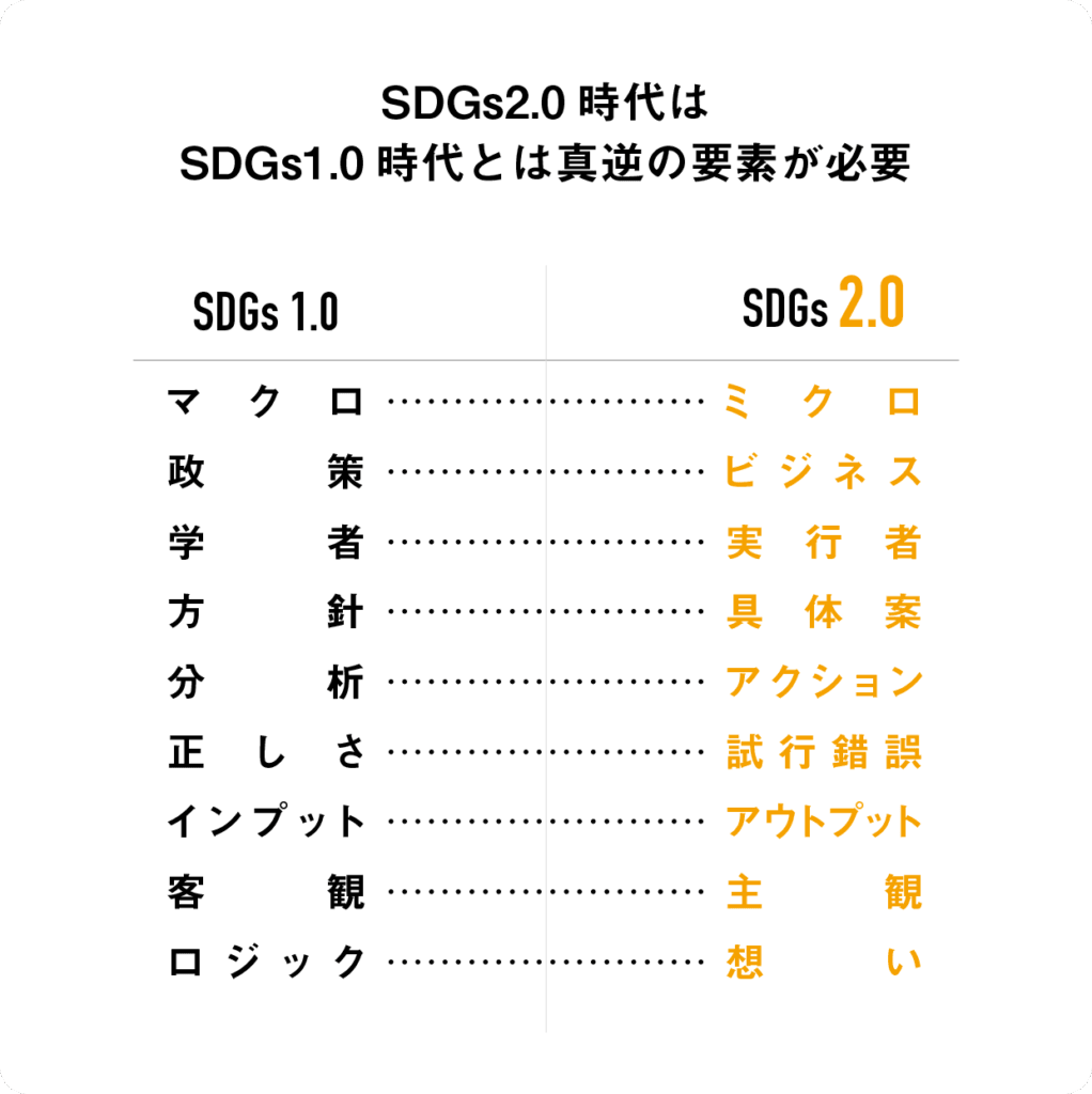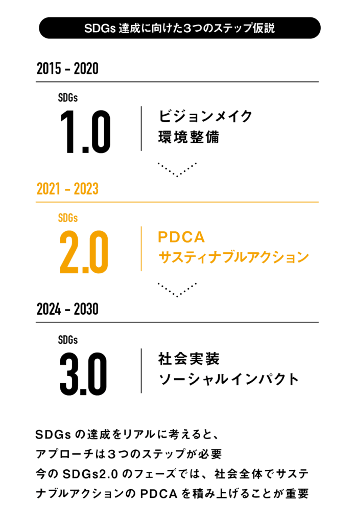 机上の議論はもうやめて、SDGsの解決に向けて社会全体で、失敗ありきで、具体的な挑戦のPDCAを回しながら次のフェーズに向けた土台を培っていく期間が「SDGs 2.0時代」。