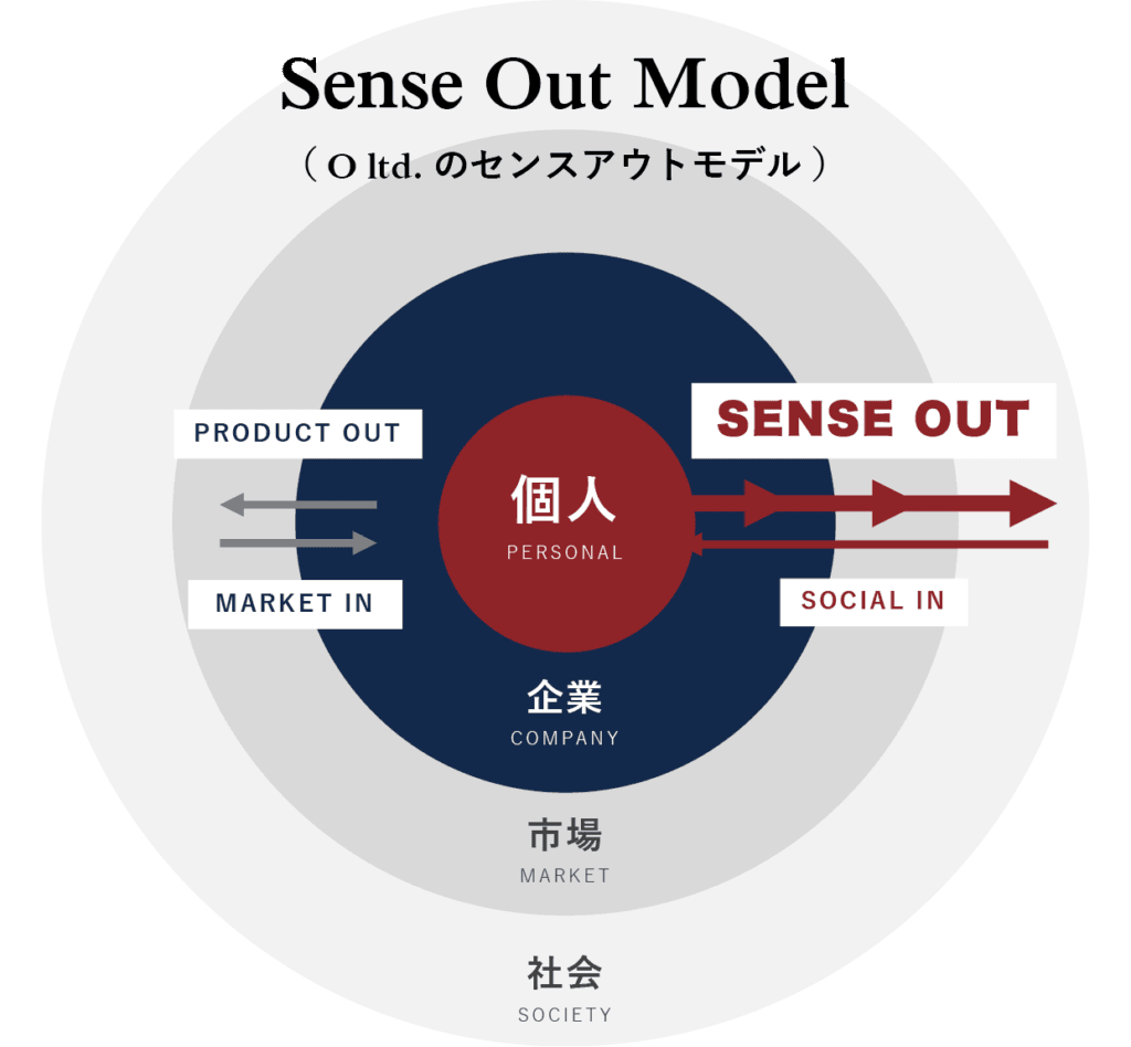 「Sense Out Model」は、2018年に僕らが提唱したマーケティングモデルなんですが、SDGs時代の事業やサービスは 「Product Out-Market In」のサイクルを回すだけではまったく不充分だと思っていて、むしろもっと企業の内側にいる「個人」の思いや感覚と、市場の外にある「社会」の課題や状況にフォーカスをした「Sense Out-Social In」のサイクルから、未来社会にあるべき事業や産業をつくり上げていくことが重要になってくると思っています。