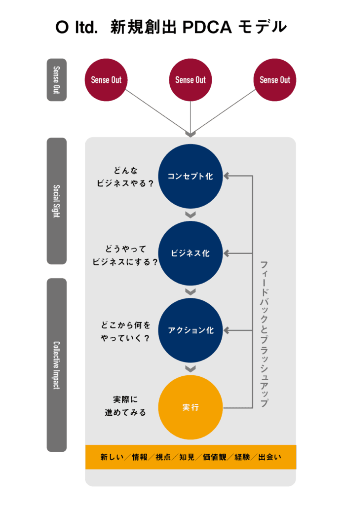 そして「Sense Out」からスタートをした先で、「コンセプト化→ビジネス化→アクション化→遂行」を進めていく。そして実態に具体的に遂行をしていくと、新たな「情報、視点、知見、価値観、経験、出会い」から次の世界が見えてくるので、そこからまたコンセプト、ビジネスのブラッシュアップと次の具体アクションを生んでいく。