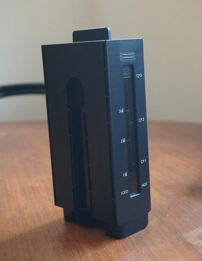 水タンクは着脱式。ホット(REGULARおよびSTRONG)とアイスごとの水位線が刻まれている。水量は機械で調整するので、水タンクへは淹れたい杯数を満たしていればいい。一度に最大で3杯分(抽出量約360ml)。マグカップにたっぷり注いで2杯分淹れられる。