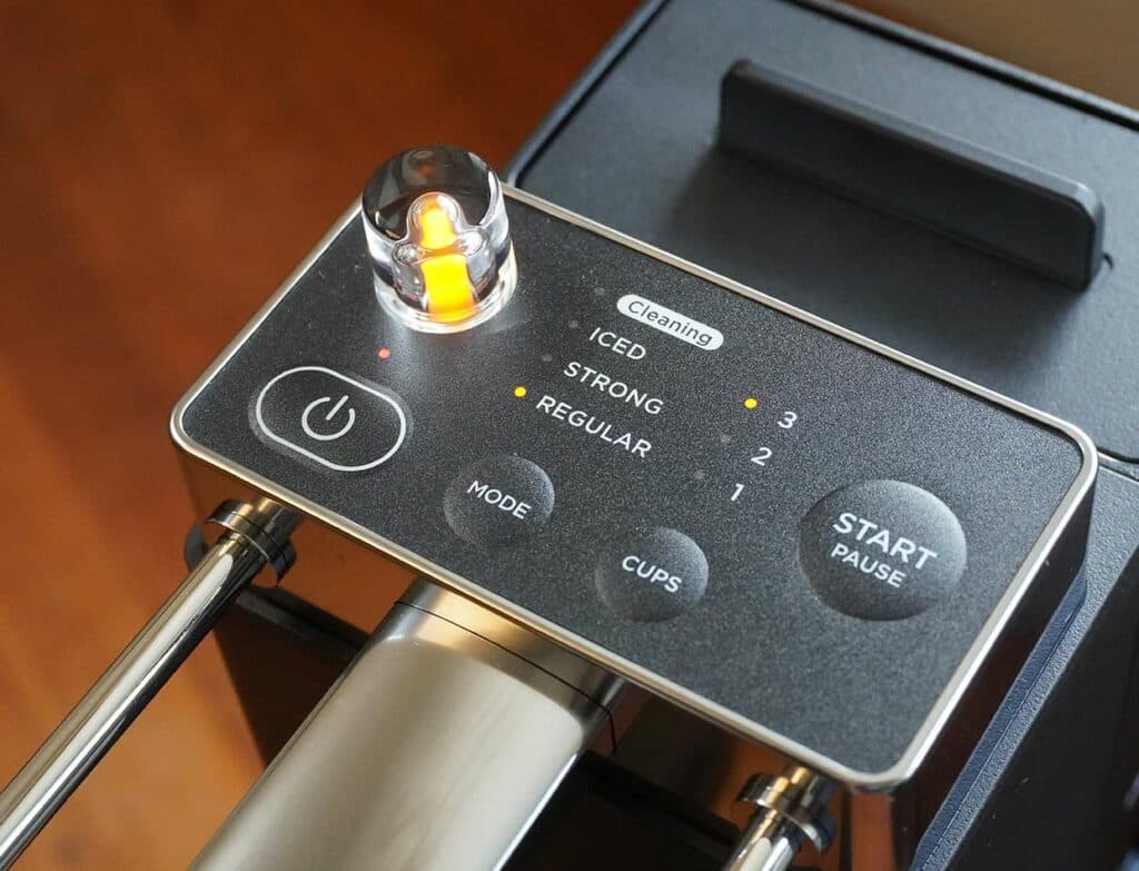 操作パネルはシンプル。電源ボタンを押すと暖かみのある色のランプが灯る。モードは「REGULAR(レギュラー)」「STRONG(ストロング)」「ICED(アイス)」の3種類。STRONGはバイパス注湯を行わないことでより力強い味わいで、カフェオレやウインナーコーヒーにも向く。ICEDは、抽出量をREGULAR比で62%、氷を入れても味わいを損なわないよう注湯間隔も変わる。