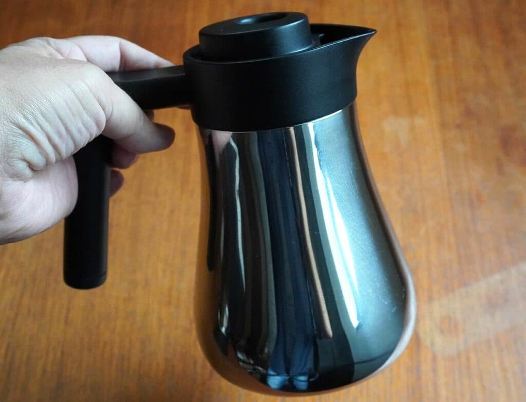 サーバーは真空二重構造のステンレス製。ヒーターによる保温は味が劣化するため、この方式を採用したという。コーヒーメーカーから外してデスクなどの上に置いておいても冷めないのはメリット。食洗機こそ使えないが、毎回水洗いする部品はドリッパーとサーバーだけなので、お手入れは容易だ。ちなみに、クエン酸水で内部を洗浄、真水ですすぎ・排出を行う洗浄運転も備える。