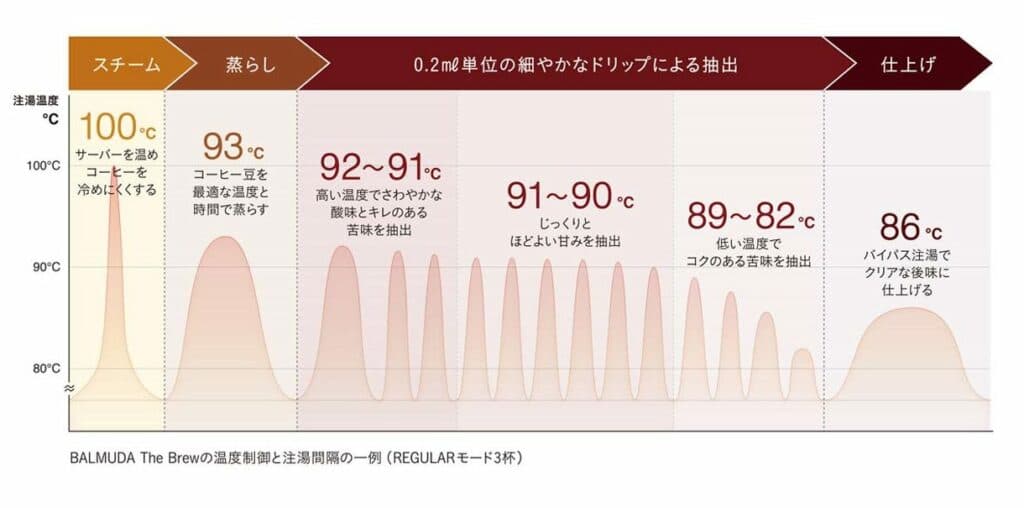 「BALMUDA The Brew」を紹介するうえで、もっとも重要なビジュアルは、この図である。不安7割で臨んだ発表会だが、この図を見た瞬間「マジか、バルミューダやりおったな!」と驚いた。円錐型ドリッパーでは湯量や速度、そして湯温を適切にコントロールしなければならないが、バルミューダは、トースターで培った高度な温度調節機能を乗せている。