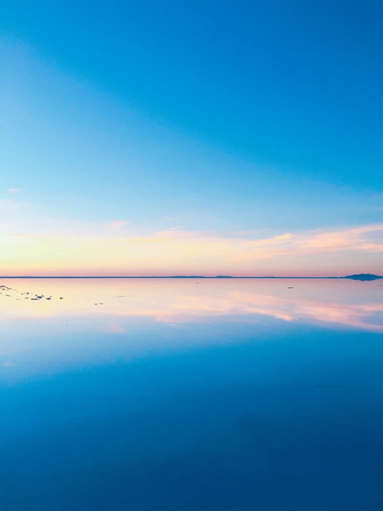ウユニに来ればどこでも鏡張りが見られるわけではない。「天空の鏡」は、いくつもの条件が揃って初めて現れる。まずはだだっ広い塩湖のなかから、適度な水量がある場所を見つけなければならない。さらに、空が晴れ、風がなく水面が安定していることも重要だ。