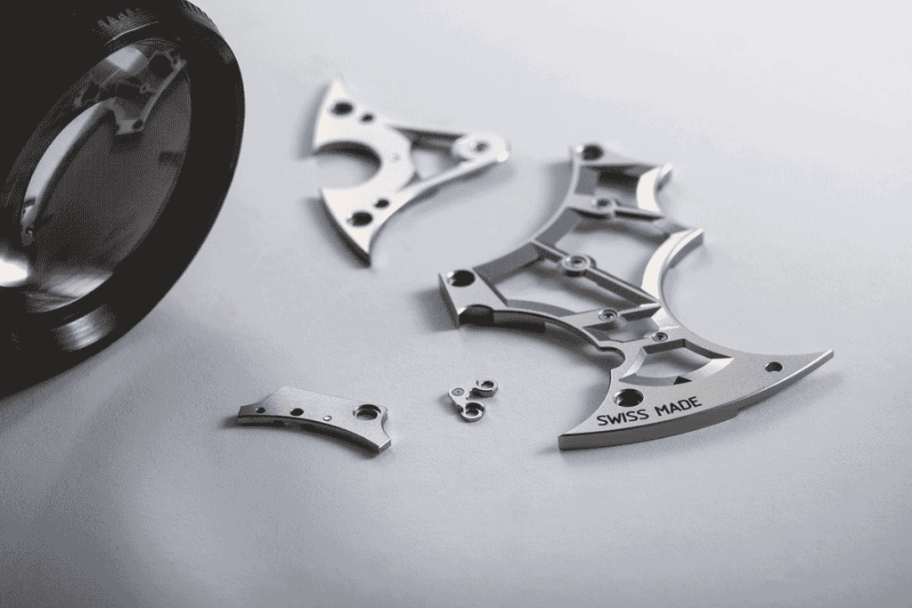 様々なポイントで薄さを追求する一方で、薄くても強度を出すために、炭素とタングステンによるタングステンカーバイドという高密度、高硬度、高耐久性の素材をミドルケースに使用し、さらにケースバック兼メインプレートやラグには、チタンを使用している。