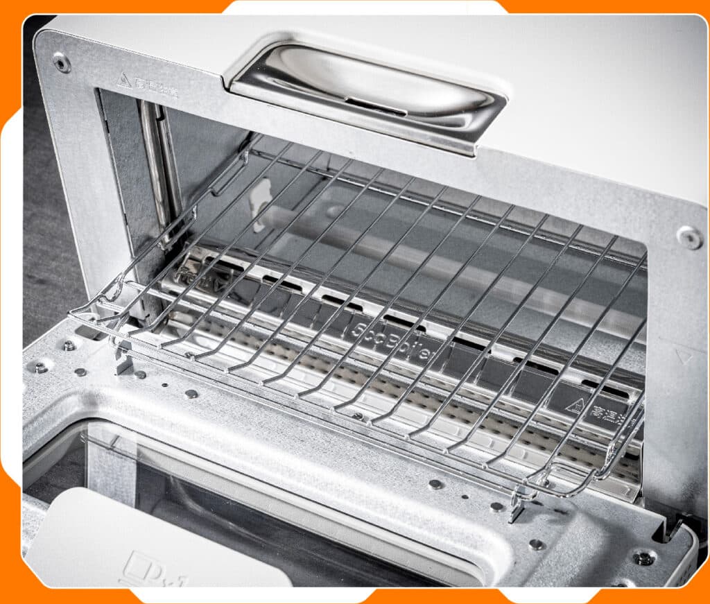 水分は空気よりもはるかに速く加熱されるため、パンの表面だけが軽く焼けた状態になり、パンの中の水分やバターなどの油脂成分や香りをしっかり閉じ込めたまま、本格的なヒーター制御で焼き上がる。トースト、チーズトースト、フランスパン、クロワッサン、クラシックの全部で5つのモードが用意されており、最適な制御を行うことができる。