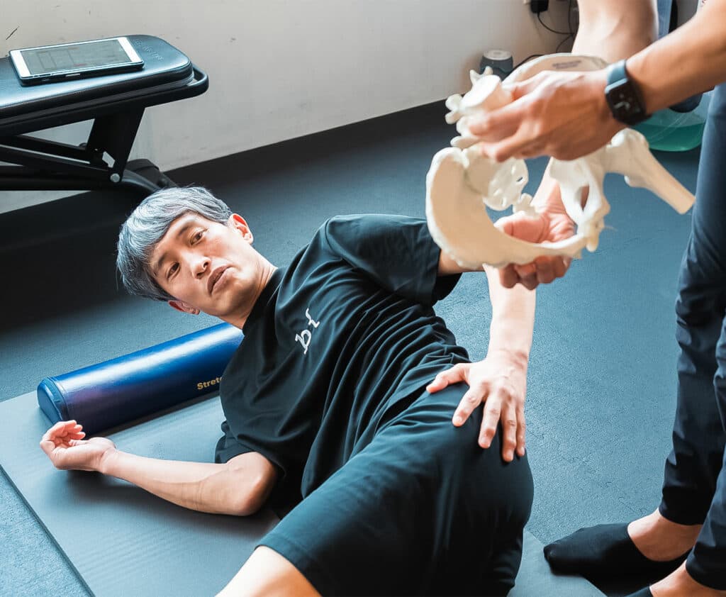 骨格の位置(骨盤と肋骨のポジション)の改善が当面の課題となるが、まずは骨盤へのアプローチからスタートする。建物に例えると骨盤は1階、肋骨は2階にあたるため、肋骨のポジションの調整には、骨盤の安定が不可欠だからだ。前回のテスト時にも骨盤のポジションや可動性を確認しているが、エクササイズを始める前に再確認。右側に比べて左側の動きが悪いため、その改善が目標となる。