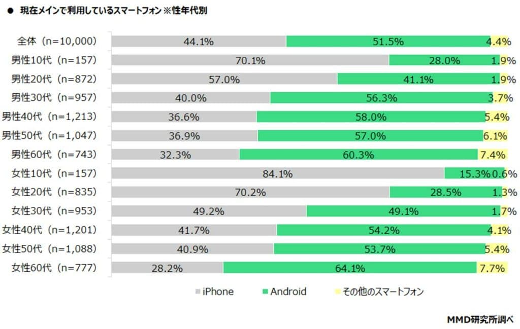MMD研究所が発表した「2022年5月スマートフォンOSシェア調査」によると、現在メインで利用しているスマートフォンは「iPhone」が44.1%、「Android」が51.5%と、Androidが少し多いという結果が出ている。年代別に見ると、10代、20代のiPhone率が高く、30代以降は少しずつAndroidが上昇している。