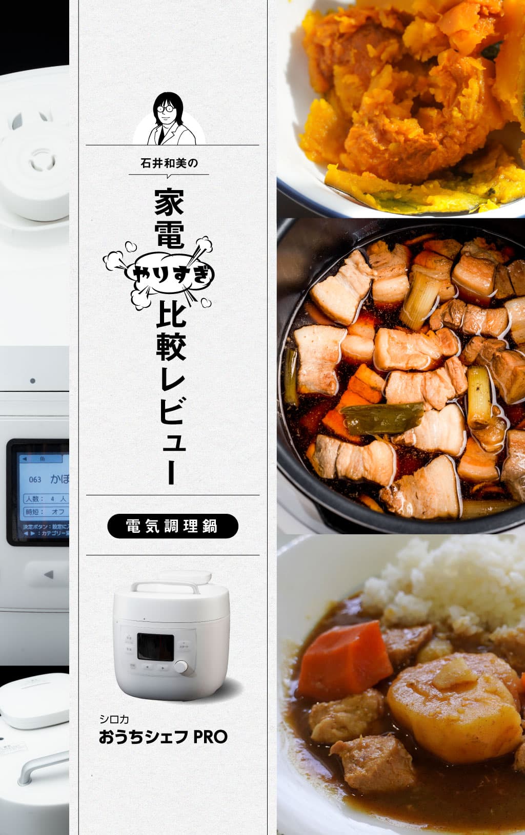 比較したのは「豚の角煮」「かぼちゃの煮物」「カレー」で、あとは本体の「操作性」「独自機能」「お手入れのしやすさ」の合計6項目で評価している。調理についてはすべて4人分、一部をのぞいて付属のレシピ通りに行い、やわらかさや煮崩れの有無、味のしみこみなどをチェックした。日常的に使うことを考え、使いやすさも評価している。