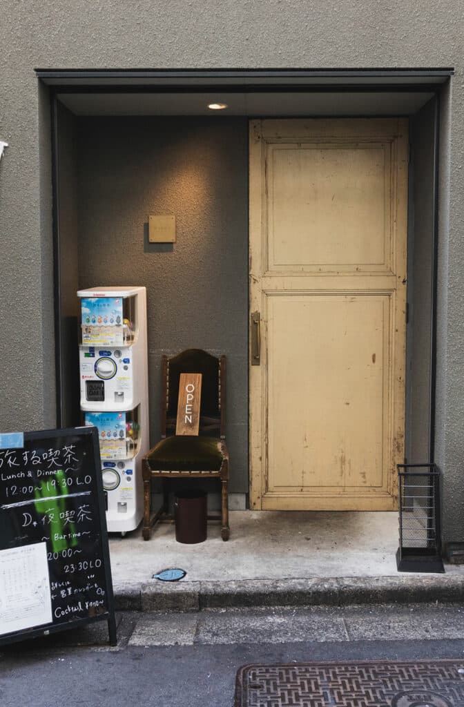 海外料理店やピンクなお店が並んでいる路地裏の一画に、「旅する喫茶」と書かれた看板が置かれていた。ヴィンテージな木の扉は、スポットライトに照らされている。扉を開くと、2階へと続く階段が現れた。ドキドキしながら階段を登っていくと、淡いオレンジが所々を照らす、やさしく淡い空間が現れる。