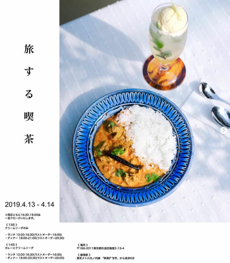 2019年4月。イベントの開催経験がある知り合いから高円寺の古民家をレンタルして、旅する喫茶はスタートした。開催日は、土曜日と日曜日の2日間で、営業時間はランチとディナーの両方。土曜日はクリームソーダのみ、日曜日はカレーとクリームソーダを提供した。