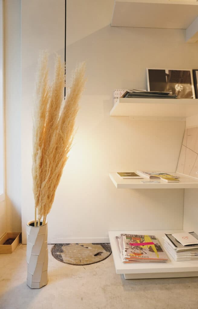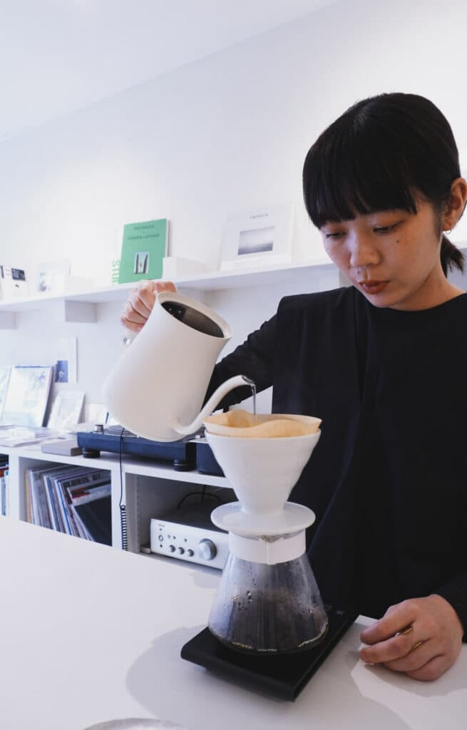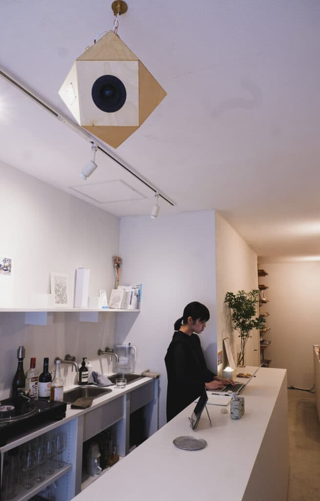 扉を開けると、りんごの木箱の上に置かれた薄いねずみ色のお香が目に入った。煙がゆらゆらたゆたい、するすると力が抜けていく。そのまま視線を左に移すと、アートブックなどの大型本が飾られた真っ白なカウンターと本棚。存在感あるレコードプレーヤーとDJ機材がどっしりと鎮座し、シンプルな空間に異彩を放つ。その前に真っ黒なワンピースに身を包んだ女性がレコードを手にして立っていた。