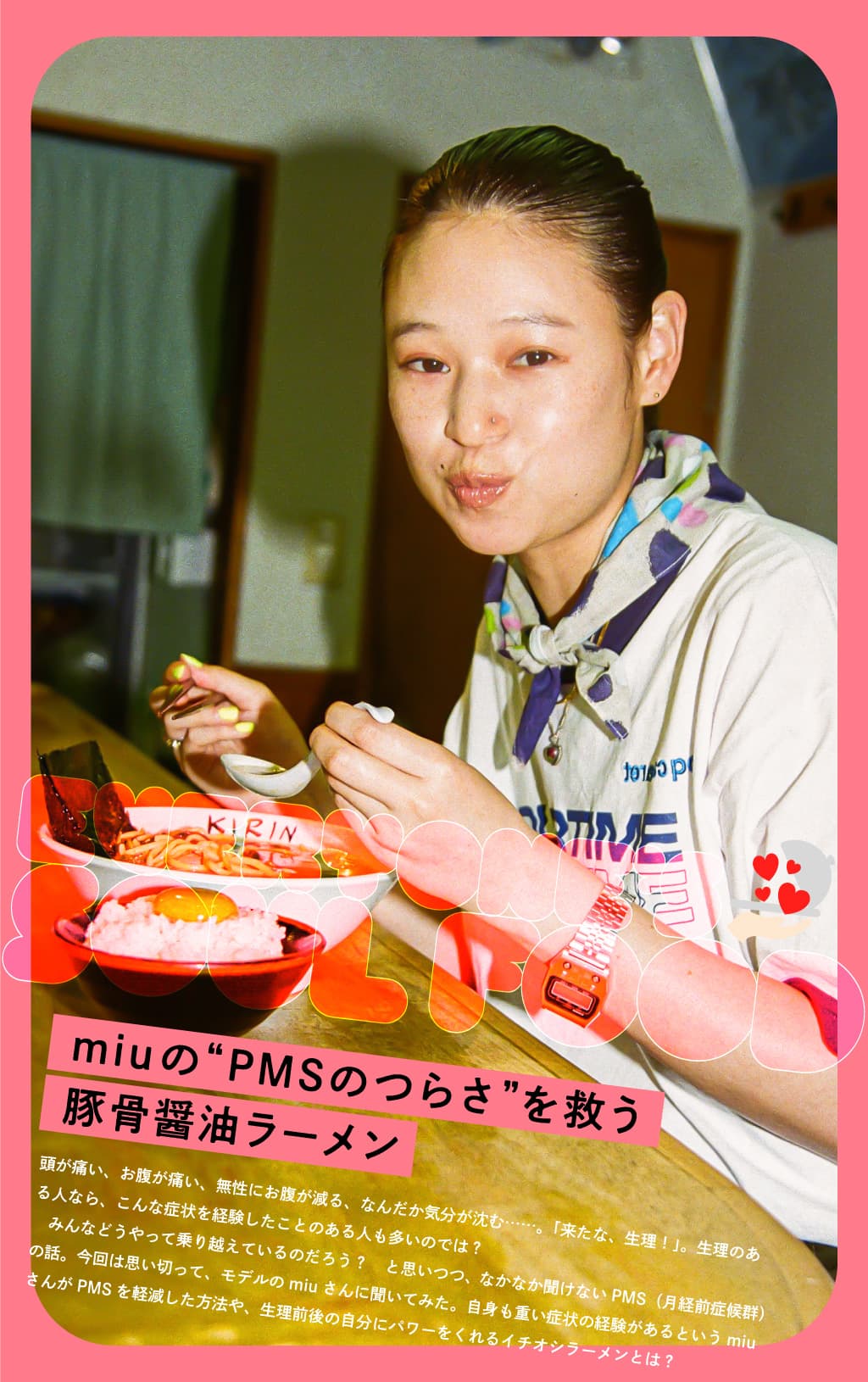 みんなどうやって乗り越えているのだろう? と思いつつ、なかなか聞けないPMS(月経前症候群)の話。今回は思い切って、モデルのmiuさんに聞いてみた。自身も重い症状の経験があるというmiuさんがPMSを軽減した方法や、生理前後の自分にパワーをくれるイチオシラーメンとは?