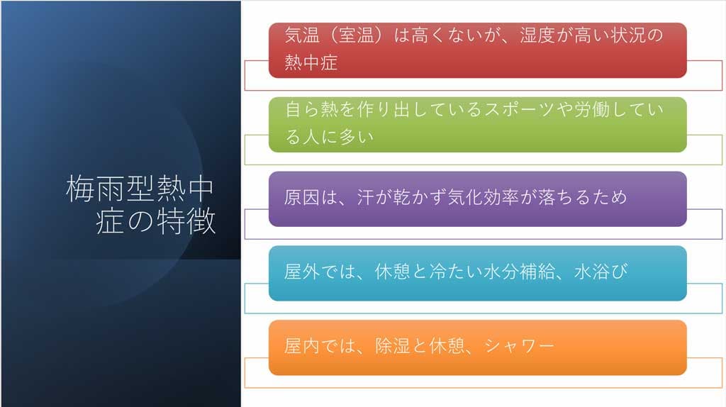 梅雨真っ最中、テスト明けで気合十分の高校生が、蒸し暑い武道館で部活の猛練習。大量の汗が噴き出して頭痛と吐き気、猛烈なダルさに襲われても、「自分が先に音(リタイア)は無理!」と意地で続行。結果、バタンと倒れてしまった…なんてケースです。そう、梅雨時でも室内でも熱中症は起こるんです。「自分は若いし平気!」ではなく、誰にでも起こりうると知っておきましょう。
