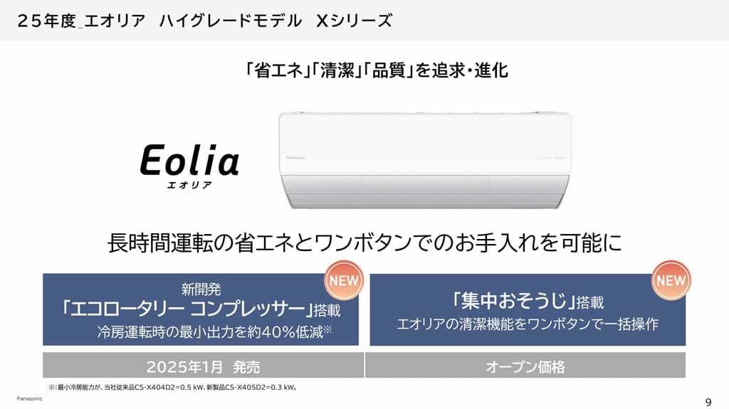 エオリア「Xシリーズ」(2025年モデル)は「省エネ」「清潔」「品質」をとことん追求・進化させたパナソニックの新世代エアコン。使用時間が年々長くなる昨今、エアコンの長時間使用で差がでる省エネ性能、内部を自動でお掃除してカビを防ぐ清潔機能、そして長く使えて壊れにくい高い品質。たとえば新開発のエコロータリーコンプレッサーで冷房運転の最小出力を約40%も低減し、省エネ性能がアップ。ボタンひとつの「集中おそうじ」機能で、面倒なお手入れもおまかせ。空気をキレイに保つ独自技術「ナノイーX」も搭載で、部屋中&エアコン内部をいつでもクリーン! もう至れり尽くせりです。