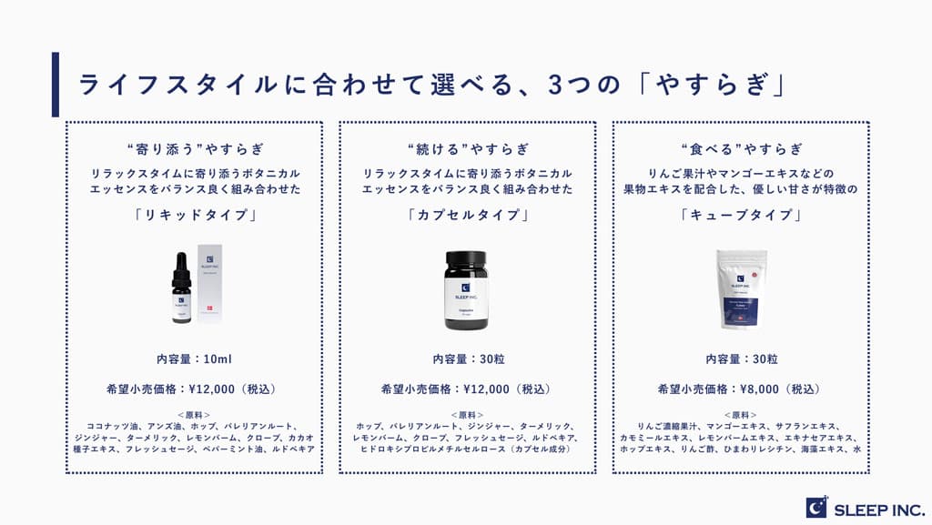 「Sleep Inc.」はリキッド/12,000円、カプセル12,000円、キューブ8,000円の3種類が用意されている。7月現在は公式Webサイトから購入できる。「Beyond Magazine記事をお読みいただいた方限定! Sleep Inc.の全商品が20%OFFになるクーポン【BEYOND20】をご利用ください。(2025年9月30日まで)