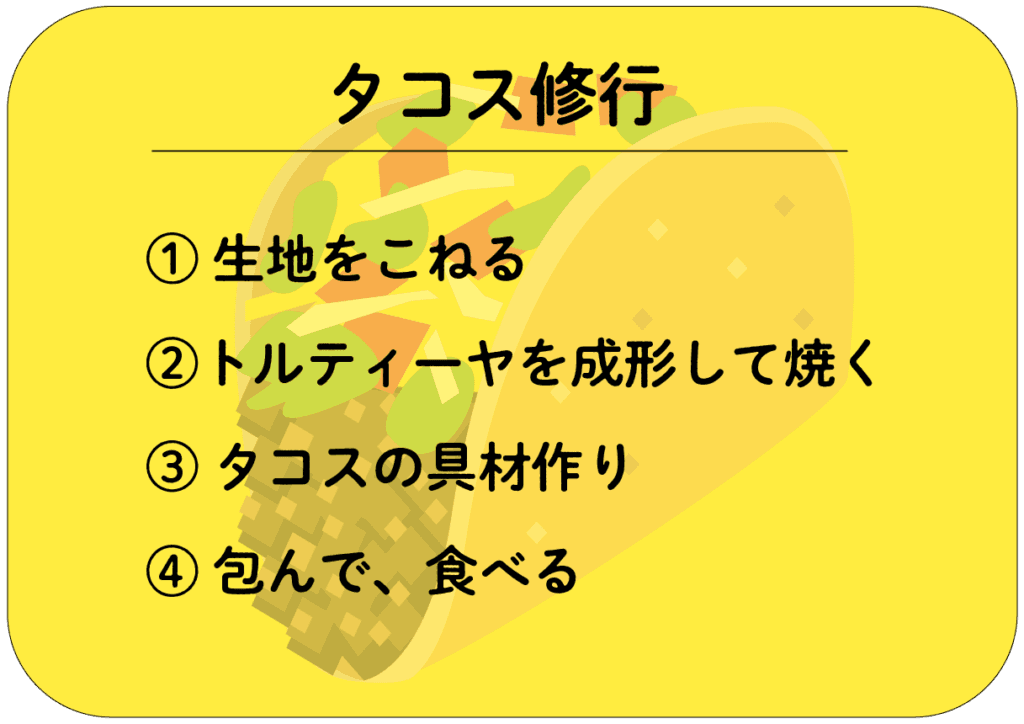 ショウ:流れとしては、とうもろこしの粉を練ってトルティーヤを焼きます。そのあと今回挑戦してもらうタコスの具材「チキンティンガ」を煮込んで、最後に包んで完成です。