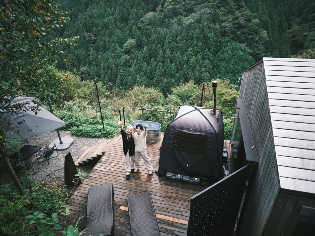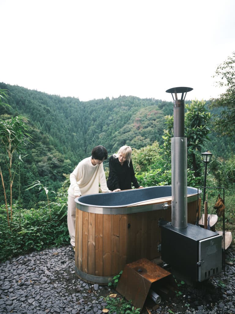 客室の外には、テントサウナと水風呂、露天薪風呂まである豪華ぶり。「できるだけ自然に近いもので」というこだわりから、サウナもお風呂も薪で温め、水は湧水を使用しています。