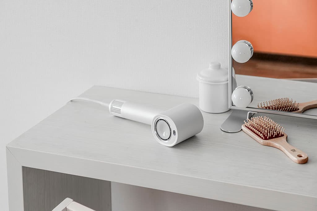 「ナノうるおいミスト美髪ドライヤー」は、ノズルが短く、重心バランスに優れたT字型デザイン。コンパクトな形状で取り回しがしやすいサイズです。カラーはホワイトとダークグレーの2色。実物を見てみると、マットな質感がどんなインテリアにも馴染み、シンプルでスタイリッシュな印象を受けます。