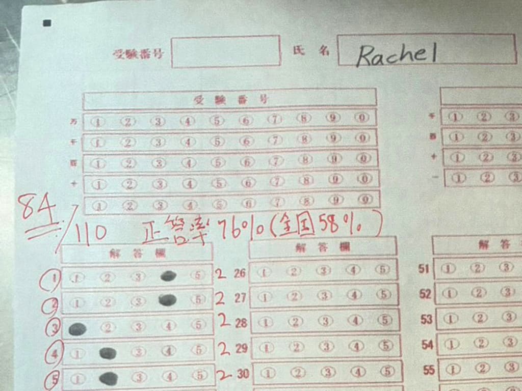 「全国平均の正答率が58%なのですが、Rachelさんは76%なので、平均よりも高いですね!」