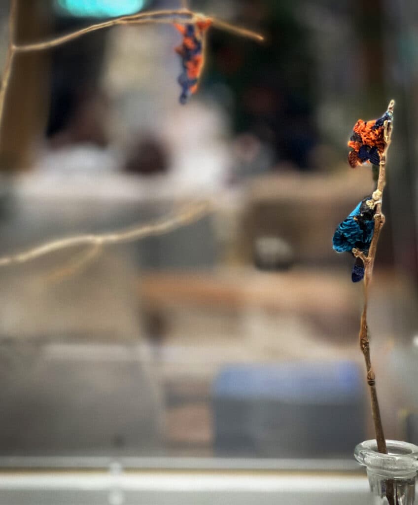 できあがったのは、ブランドのドレスと同じテキスタイルでつくられたオシャレなミノ。ミノムシの雄どころか人間の目まで奪う美しさ、華やかさと楽しさがある。