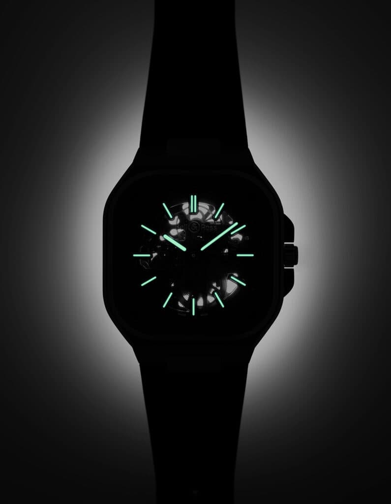 発表からわずか1年半ながら「BR 05」のラインナップは急速に拡充。ダイアルカラーはもちろんのこと、クロノグラフの搭載やスケルトンダイアル、ゴールド素材の採用など、同コレクションでもすでに多彩なバリエーションを展開しているが、最新の「BR 05 スケルトン ナイトラム」は、スモークグレーのスケルトンダイアルと、グリーンのスーパールミノバを塗布した時分針&インデックスを備え、近未来感のある新鮮なルックスを創出している。
