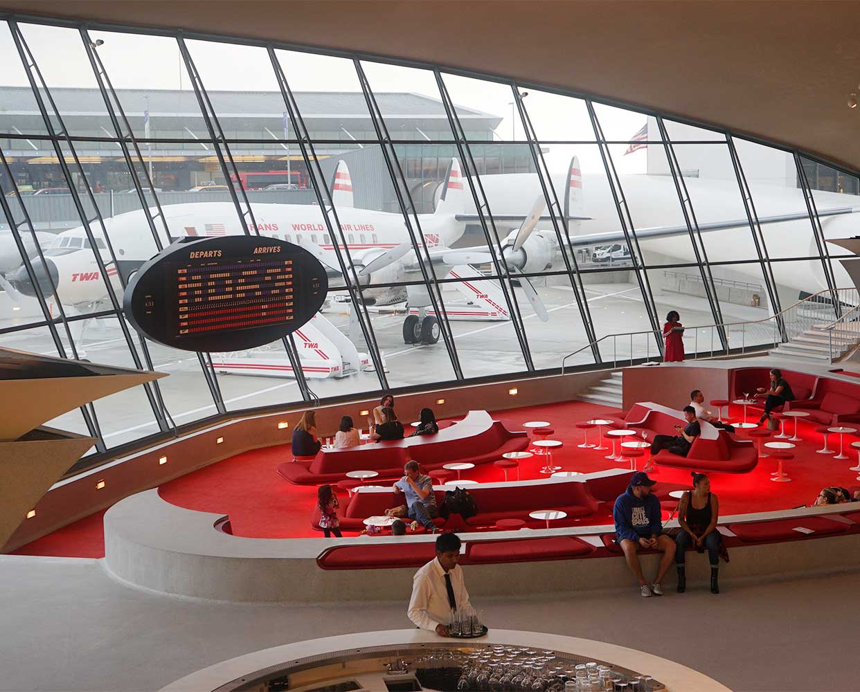 で、そうだった。話は戻ってTWAホテル。ここはかつてアメリカに存在していた航空会社、トランスワールド航空(TWA 航空)が使用していた、ニューヨークJFK空港のターミナル5をターミナルまるごとホテルにリノベーションしてしまったという壮大なもので、その建築は世界的に有名な建築家、エーロ・サーリネンによる代表作のひとつであり、翼を広げたカモメのような伸びやかな流線型ラインの外観に特徴がある。