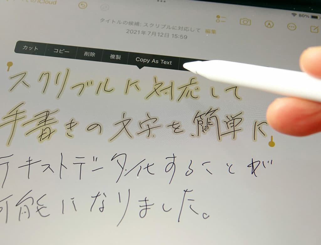iPadの代名詞にもなったApple Pencilにも、強力な新機能が加わりました。iPadOS 15では、iPadOS 14で導入された「スクリブル」という機能がついに日本語に対応しています。この機能を使うと、例えばメモアプリに取った手書きのメモを、簡単にフォントに置き換えることが可能になります。ベータ版ですが、精度もまずまず。走り書きのような字の場合は認識しないこともありますが、一部だけでもテキストデータに置き換えておけば、後々の検索性がアップします。