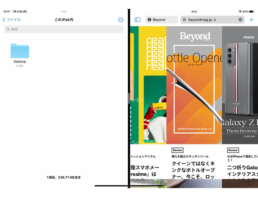 iPadならではだったマルチタスキングも、iPadOS 15で大きく改善されています。iPadOS 14までは、1つのアプリを起動している最中にドックを開き、2つ目のアプリをドラッグ&ドロップする必要がありました。操作が煩雑なうえに、ドック内にないアプリは起動できず、PCなどと比べて、複数のアプリを表示しづらかったのが難点でした。iPadOS 15では、こうした複雑さが排除されています。
