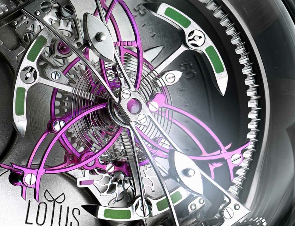 この「ロータス」は、造形美だけでなくメカニズムも驚異的だ。動力ゼンマイなどは、丸いベース部分に収められており、その天面が24時間で一周することで時刻表示となる。そしてスッと伸びた蓮の花が心臓部となっており、花の内側にあるガラスドームの中には3D回転する「トリプル・アクシス・トゥールビヨン」が収められ、正確に回転して時を刻む。