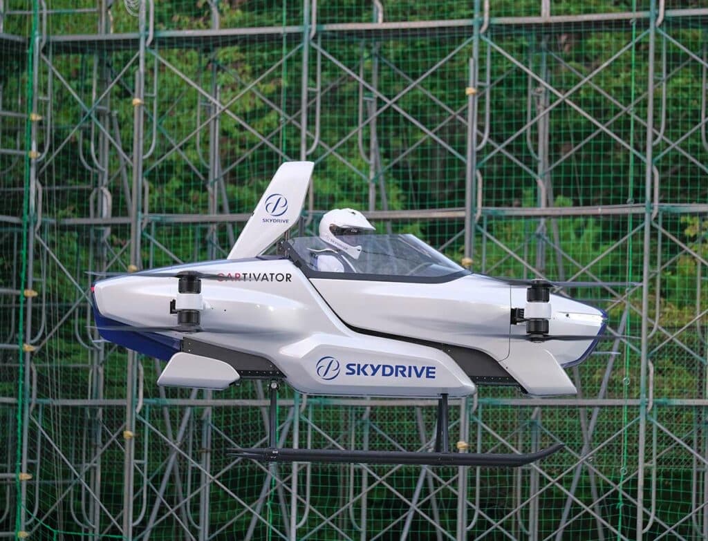 では、我々が最初に触れるであろう”空飛ぶクルマ”はどんなスタイルで、どれくらいの性能を有しているのだろう。SkyDriveが開発しているのはeVTOL(electric vertical take off and landing)と呼ばれる電動かつ完全自立の自動操縦、垂直離着陸モデルで、2020年8月には有人の実験機「SD-03」で約4分間の公開飛行試験に成功している。