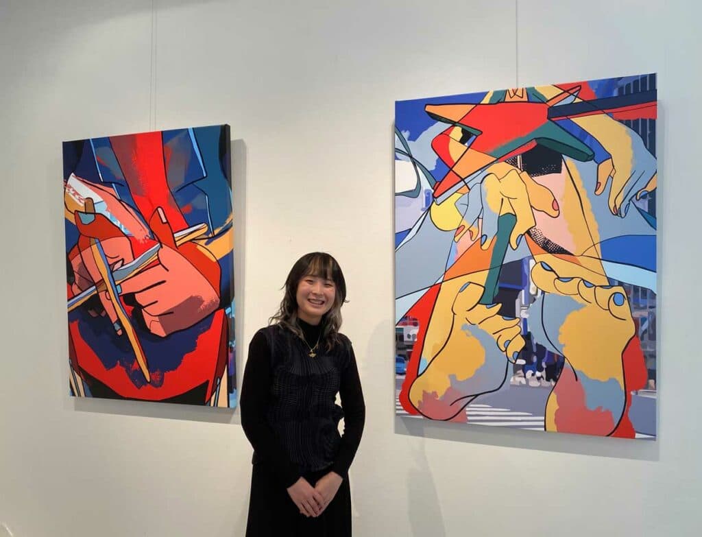 展覧会で作品を見たとき、まず惹かれたのが「色」。iPhoneやiPadのペンツールで描き、カンバスにデジタル画像をインクで出力、出力されたデータを瞬時に削除して一点物の作品を創るというZ世代ならではの制作方法も印象的でした。