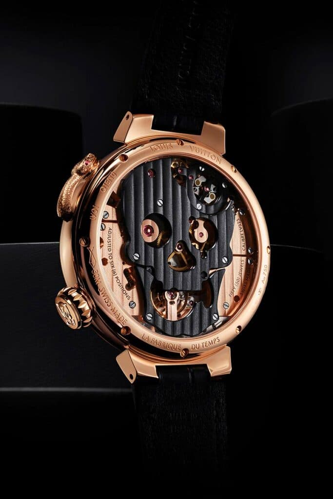 ヘビの頭が右側にずれると額のジャンピングアワーが現れ、さらにヘビのしっぽが動いてレトログラード式の分を表示し、さらに目の奥のモノグラム·フラワーの形が変わる。そして骸骨の口が開いて、その奥から「Carpe diem」の文字が現れるという高度な仕掛けになっている。こういったからくり機構は、18世紀ごろに生まれた古の技術であるが、これもLFTLVにて開発と製造を行っている。
