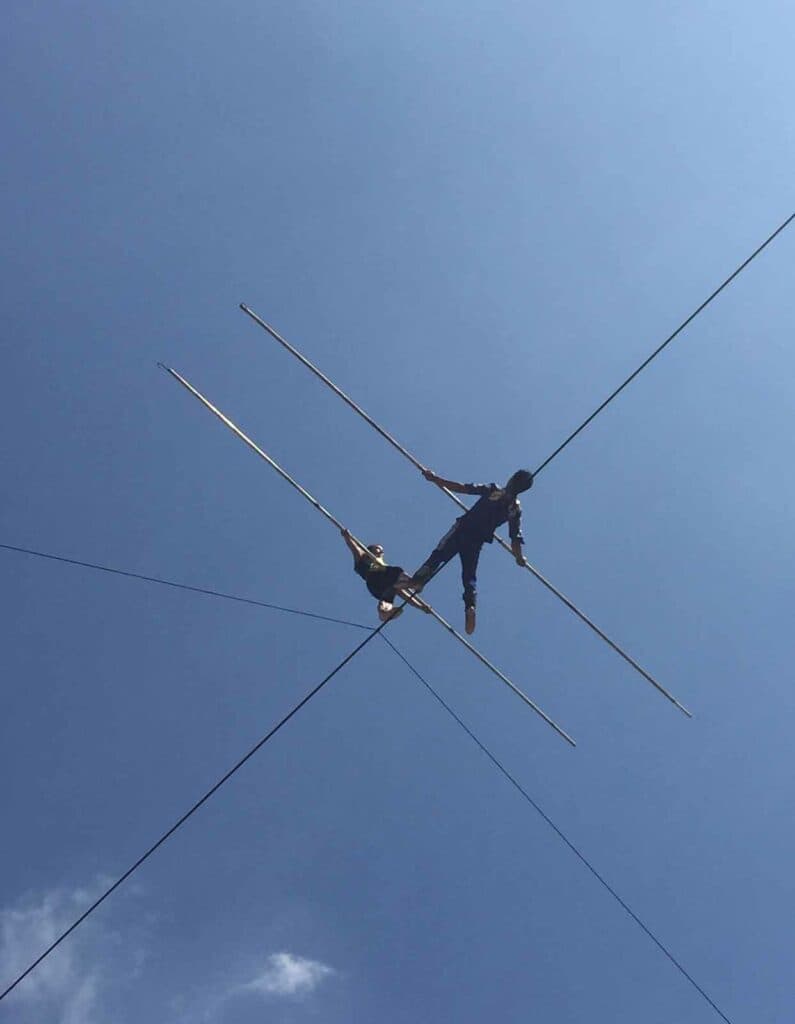 何しろ標高がそこそこ高いものだから、観客席にいるだけでも風の強さを感じる。はるか上空に張られたロープの状況は推して知るべしだ。そんな悪環境の中、2名が両端から綱を渡って真ん中で合流し、一人が横になってもう一人がまたいですれ違うという、やたらと高度なパフォーマンスを見せてくれる。観客から悲鳴が上がるが、その多くは真下にいる自分たちの心配をしていると思う。演技の最後には、ロープの上を小走りに駆け抜けてひと盛り上げしていった。