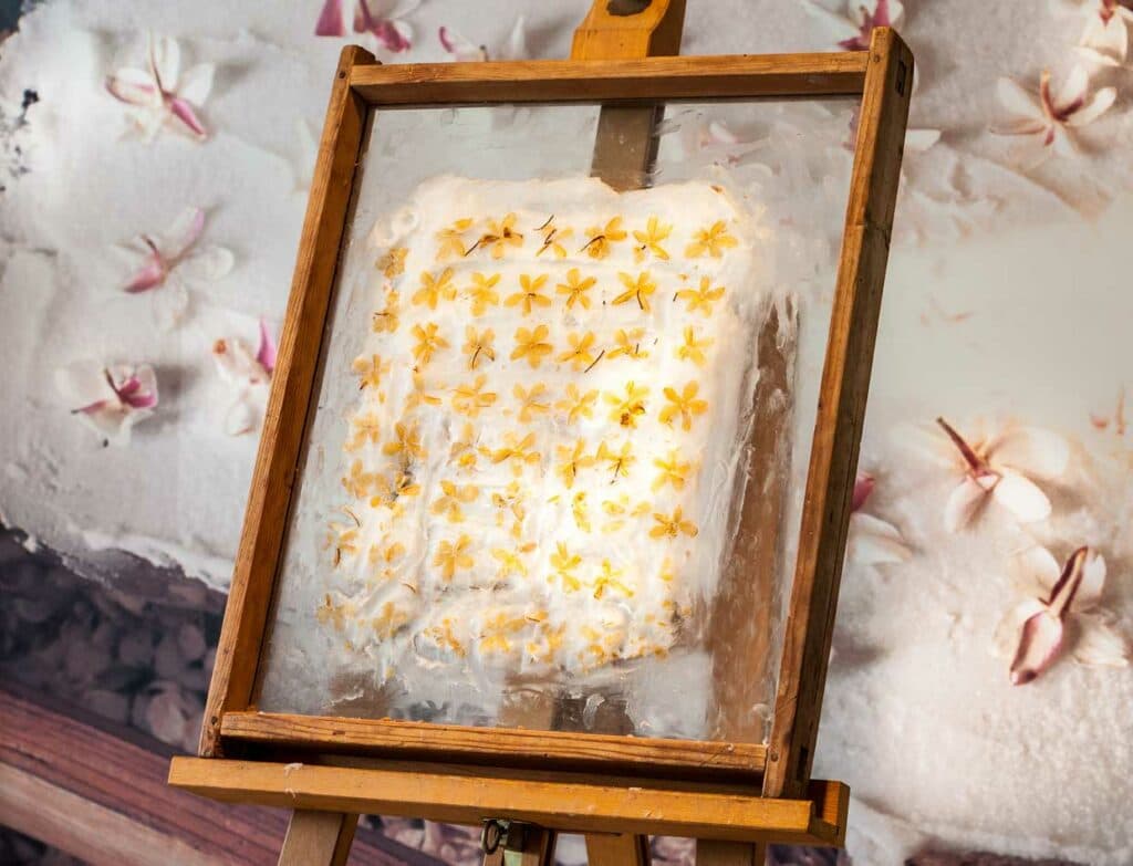 花の鮮度を保つために、花は畑のすぐそばで天然の植物油に浸されます。従来のアンフルラージュ法では、動物性油を使用していましたが、より時代に合った植物性オイルを使用することへの進化。
