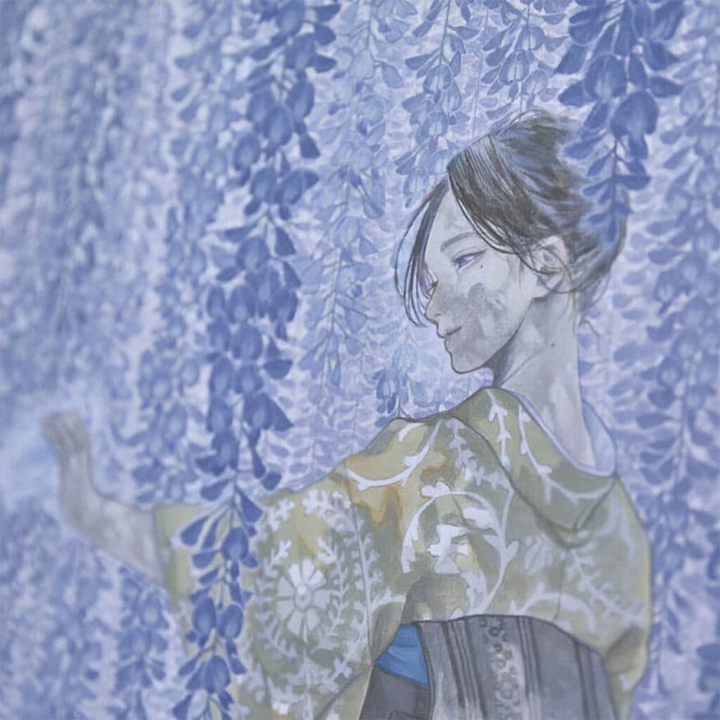 そのころは、美人画とイラストをミックスしたような日本画調のタッチだったんですが、とにかくしんどかった。「この絵じゃ食べていけないな……」と薄々わかっていたので。そのとき飾っていた中の一枚が、藤と女性がモチーフだったんですけど、花の量が半端じゃない! 毎日描いても描いても全然終わらない……諸行無常(笑)。