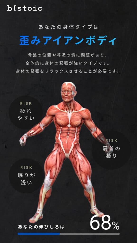 筆者のBODY IQは76。ボディタイプは「歪みアイアンボディ」と判定された。BODY IQの平均は70~100あたりとのこと。ギリギリ平均クリアという、嬉しいのか嬉しくないのかの判断が難しい結果となった。