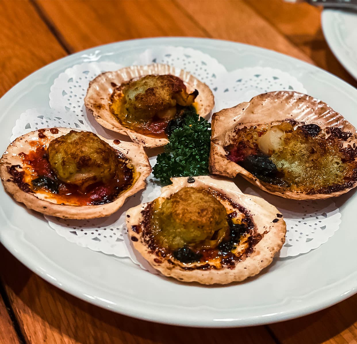 「ポテトのチーズ焼き」はビールが進む。「帆立貝のガーリック風味焼き」は白ワインも良い。