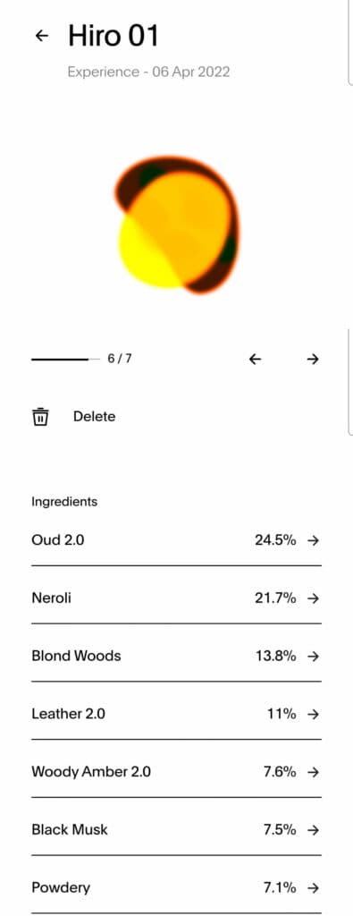 AI が私に提案した香りはウッディー、フローラルフルーティーな甘い香り、グルマンの 3 つ。この中から好きな香りのブレンドを調整して、さらに 4 つ目の香り(実際のサービスでは 2 つ)を。多くの体験者は、3 つの中から最初に提案された香りを選ぶそうです。
