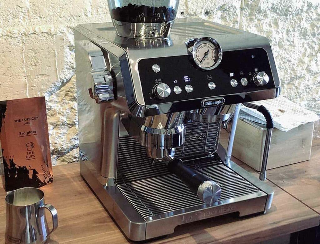 今回登場するのは「デロンギ ラ・スペシャリスタ・プレスティージオ グラインダー付きエスプレッソ・カプチーノメーカー EC9355J-M(以下、ラ・スペシャリスタ・プレスティージオ)」。エスプレッソやカプチーノが淹れられる、いわゆるエスプレッソマシンだ。デロンギといえば、ボタン1つでエスプレッソが淹れられる全自動コーヒーマシンが知られているが、これはあえて1つ1つの作業が独立した半手動式だ。