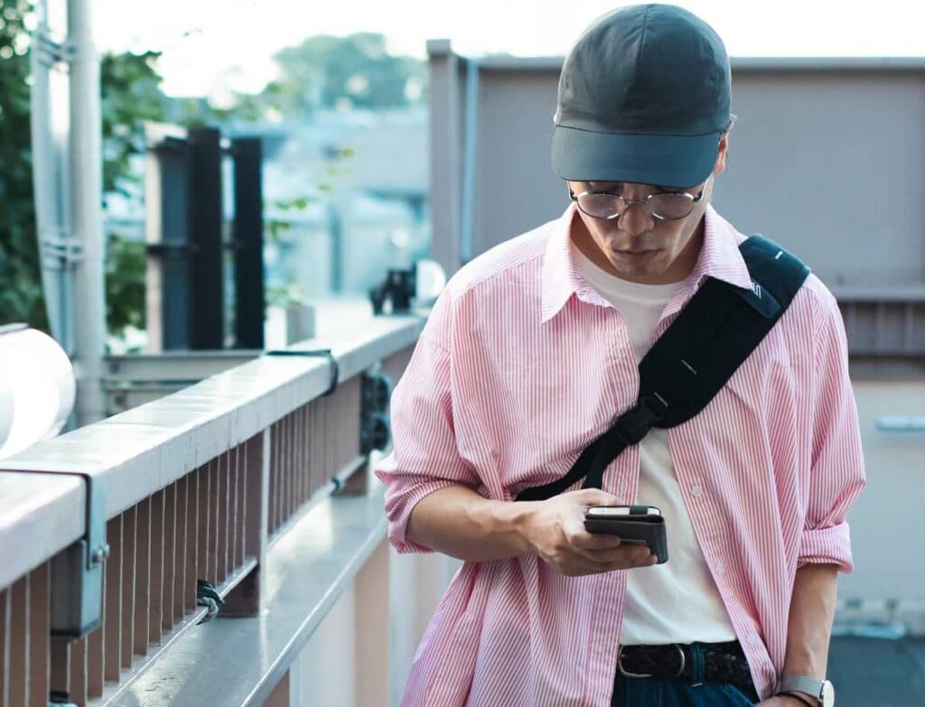 最後に全身のバランスでチェック。帽子を試着するとき、ついつい顔まわりだけで完結してしまいがちだが、帽子もファッションの一部なので全身の印象も確認しよう。今回はキャップの黒を拾うように黒のボディバッグとグレーのスニーカーをチョイス。小物のカラーを同系色にすると全体的にまとまった印象になる。