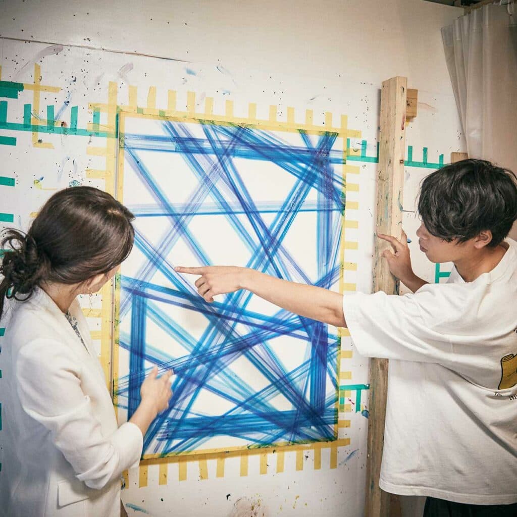 自らもアートコレクターでアートビジネスの起業家でもある岩崎かおりさん。今回訪ねたのは「大学院の修了作品展で、作品の制作意図を伺って、面白い! と買わせていただいたのがご縁」という三浦光雅(みうら・こうが)さんのアトリエです。色の線が何層にも重なる絵画作品ですが、色選びやその組み合わせ、どこに何本の線を引くのか、といったあらゆる構成要素に三浦さんの意思は介在していません。では、どうやって描くのか。そもそも、絵を描く、とは。興味深い対話となりました。