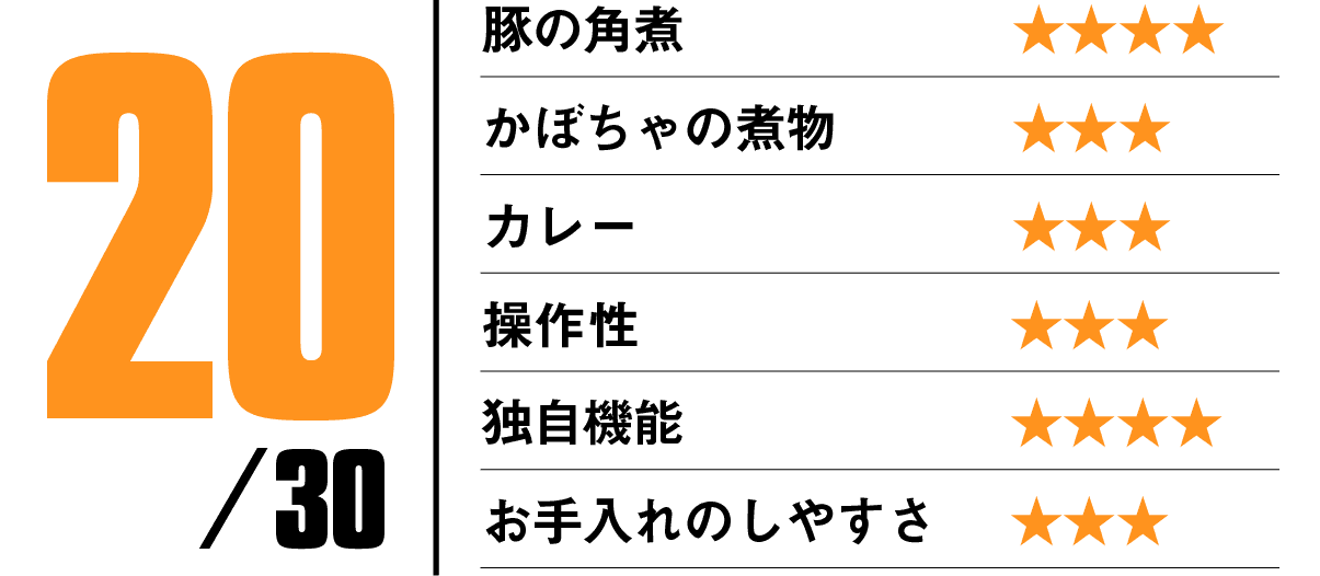 比較したのは「豚の角煮」「かぼちゃの煮物」「カレー」で、あとは本体の「操作性」「独自機能」「お手入れのしやすさ」の合計6項目で評価している。調理についてはすべて4人分、一部をのぞいて付属のレシピ通りに行い、やわらかさや煮崩れの有無、味のしみこみなどをチェックした。日常的に使うことを考え、使いやすさも評価している。