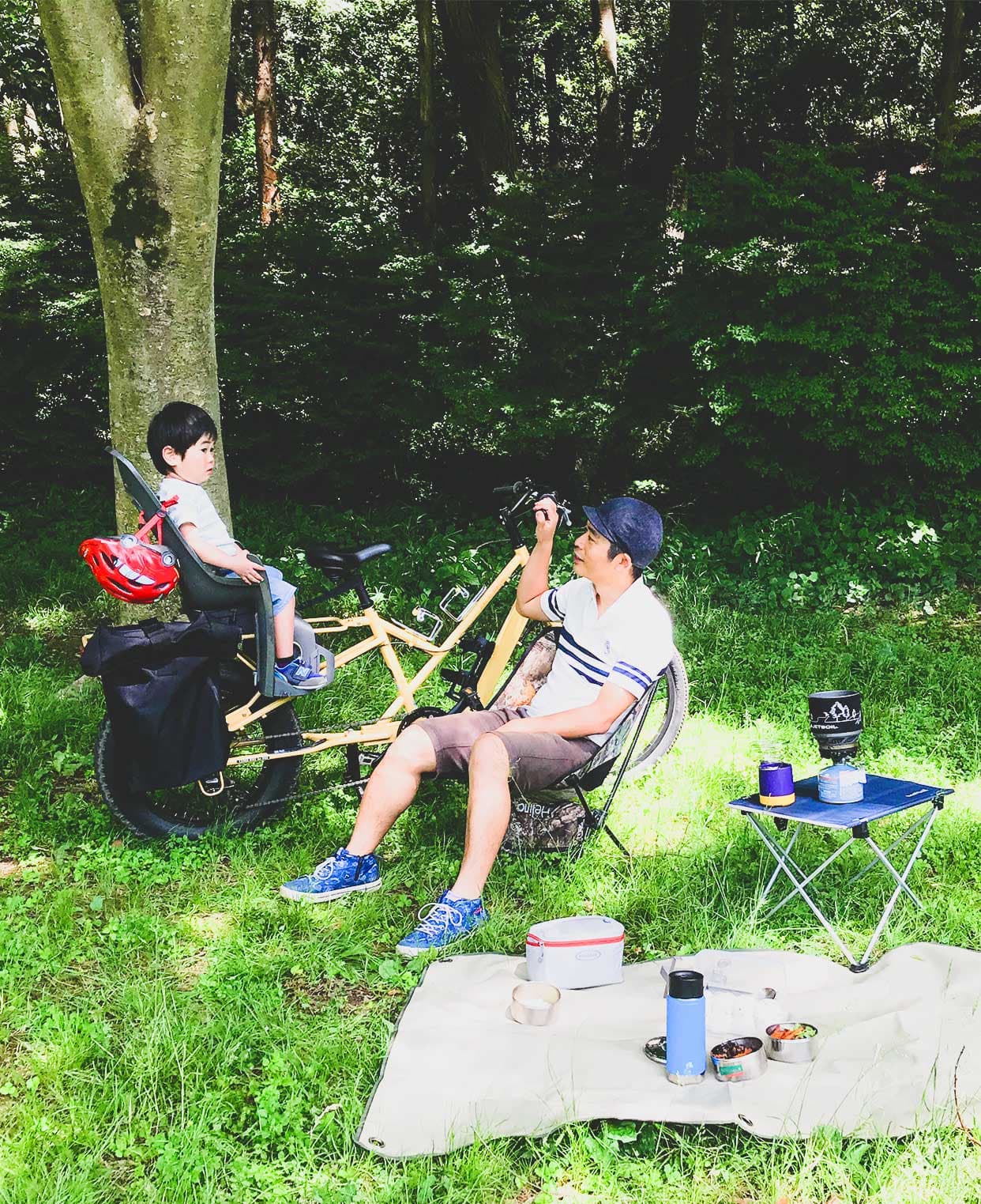 ちなみに私は自転車用パニアバッグと、フロントフォークにキャリアを装着してピクニック&キャンピング仕様にカスタマイズして楽しんでおります。低重心で超安定志向に設計された車体は子ども一人にソロキャン装備を積んでも、ふら付くことなく安定して走れます。