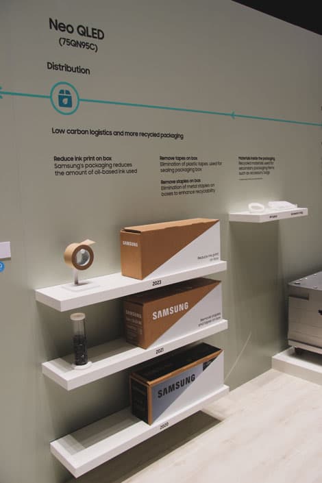 サムスンでもこの課題に取り組むべく、再生樹脂を使用したプラスチックの使用量は2021年から現在において3倍に増加しており、それに伴い梱包の簡素化などの取り組みも進められている。